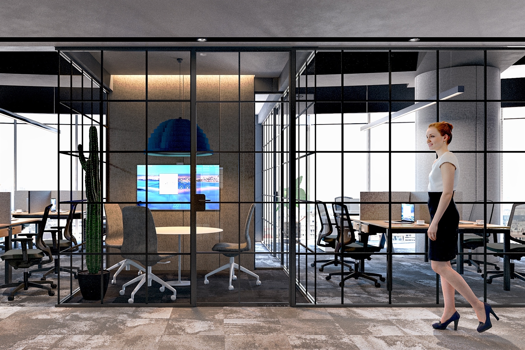 Ziyaretçilerin firma kimliği ile buluşacağı biri yönetim kurulu bölümünde, diğeri ofislerin bulunduğu bölümde bulunan iki ayrı giriş ve karşılama alanı oluşturuldu. Tasarım şirketin güçlü kimliğini vurgulamayı hedeflemek ile birlikte mekanın dairesel formunu kullanarak oluşturulan keskin altıgen plan formu açık ofis alanlarının tasarımında bağlayıcı olmuştur. Çekirdek çevresinde duvarda server, arşiv, depo gibi hizmet alanları bulunurken bunun devamında altıgen formu koruyan bir sirkülasyon hattı planlanmış ve bu hat üzerinde açık ofisler, yarı kapalı alanlar ve kapalı alanlar konumlandırılmıştır. İki karşılama alanını ve ofisteki tüm fonksiyonları birbirine bağlayan bu sirkülasyon hattı boyunca çalışanların tek çalışabilecekleri, aynı zamanda grup aktiviteleri ve toplantılara hizmet verebilecek ortak alanlar oluşturulmuştur. Açık ofis bölümünde çalışanların koridor hattını kullanan diğer kişilere karşı mahremiyetini sağlayabilmek için, ofisin genel tasarım diline uygun yarı separe yüksek modüller tasarlanmıştır. Böylece ofislerin birbirinden bölücü duvarlarla ayrıldığı küçük ofis alanları oluşturulması engellenerek, tek bir açık ve ferah ofis alanı oluşturulmuş, büyüme durumunda oluşacak olan çalışma düzeni alternatifi sağlanabilmiştir.